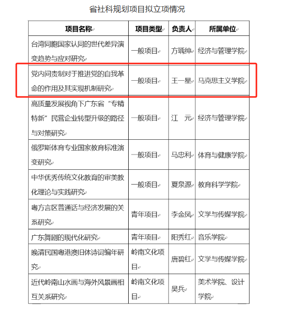 近日,广东省社科规划2024年度常规项目及三类研究专项的立项名单公布。公司王一星老师的课题《党内问责制对于推进党的自我革命的作用及其实现机制研究》获批立项。