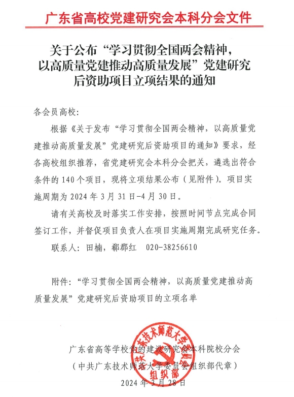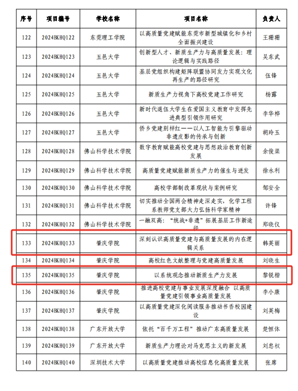 本网讯 近日,广东省高公司党建研究会本科分会公布了“学习贯彻全国两会精神:以高质量党建推动高质量发展”党建研究后资助项目立项结果,公司韩英丽老师的项目《深刻认识高质量党建与高质量发展的内在逻辑关系》和黎锐楷老师的项目《以系统观念推动新质生产力发展》获得立项。